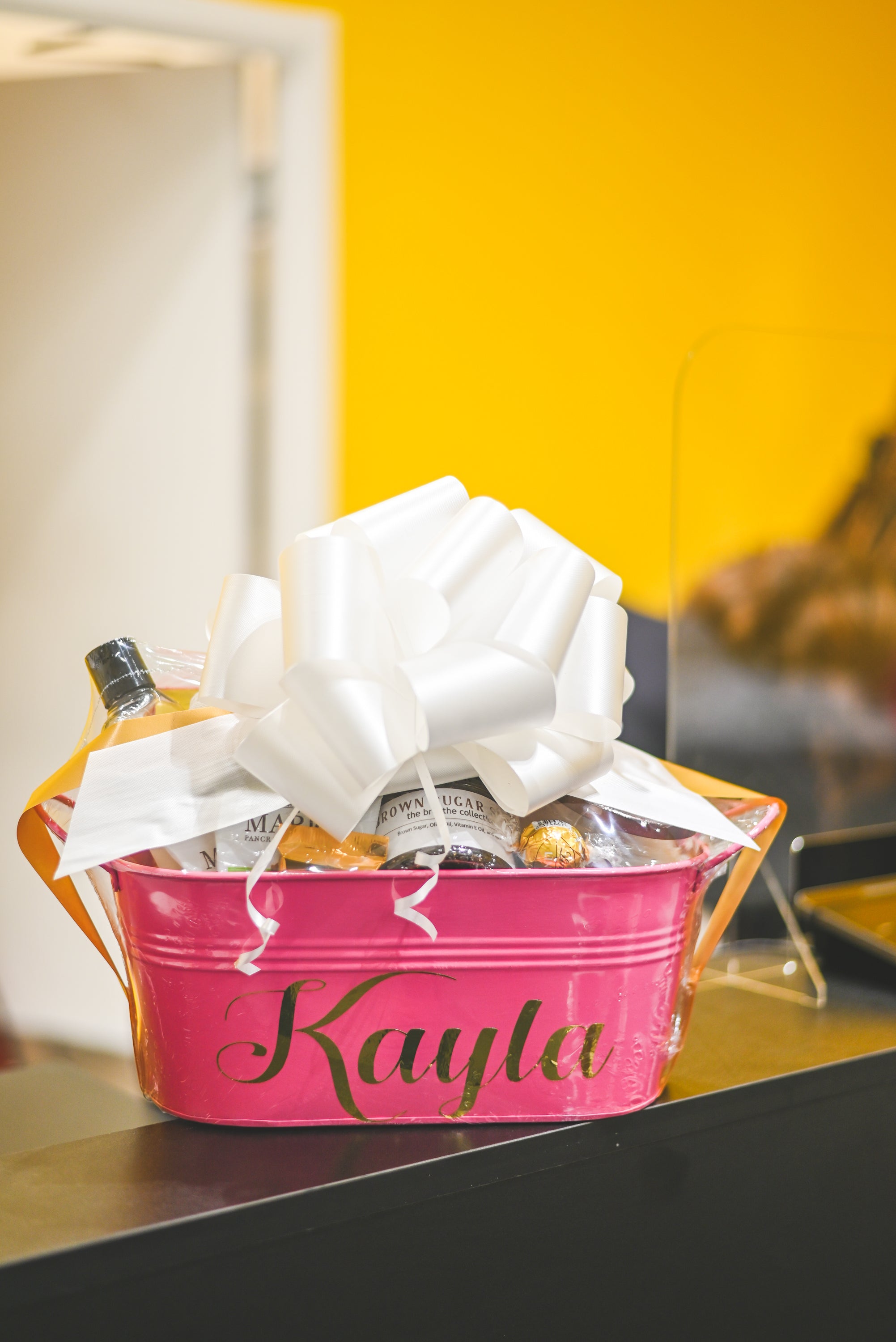 Add a personal message card inside of your gift basket! You can also optionally add a custom name on the outside of the basket.